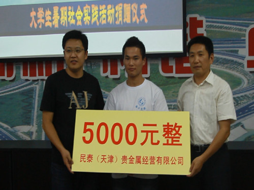 捐赠仪式上,民泰(天津)贵金属经营有限公司董事长毕研平向团队支教地河北省保定市阜平县龙泉关镇八里庄小学捐赠现金5000元,并表示,随着活动的后续开展,如果当地孩子们需要,可以根据实际情况再进行捐赠,帮助孩子接受更好的关怀和教育。学院党总支副书记王光坊对民泰(天津)贵金属经营有限公司的支持和爱心深表感谢,并表达了对爱心支教团队的期许,希望团队中的成员勤于吃苦,乐于奉献,在做好爱心传递的同时注意安全。“情系阜平,共筑中国梦”爱心支教团队队长宋世莲代表团队表达了团结一心、甘于奉献的决心,并表示一定不负众望。