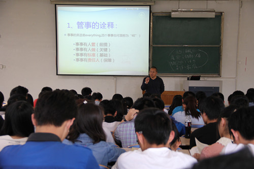 管理=管事+理人+安人,会上,王新军用这样一个公式对团队管理进行诠释,并从事事有人管为前提,事事有人做为关键,事事有标准为基础,事事有责任人为保障四个方面展开,提出了每个组织都应遵守的4R原则,即“找对的人、放在对的位置、用对的方法、做对的事”。随后,他从管事、理人、安人三个方面对团队建设进行讲解,把学生会管理与企业管理相通相容,他强调,理人不是管理他人,而是理解他人,一个成功的领导者应该学会有效的沟通,彻底认识人并进行有效的领导。幽默风趣的语言,典型鲜明的例子,深深吸引了在座的每一位同学。最后,王新军送给同学们一句箴言“从学生会工作中解读出与人生相符的东西作为人生管理的准则”。