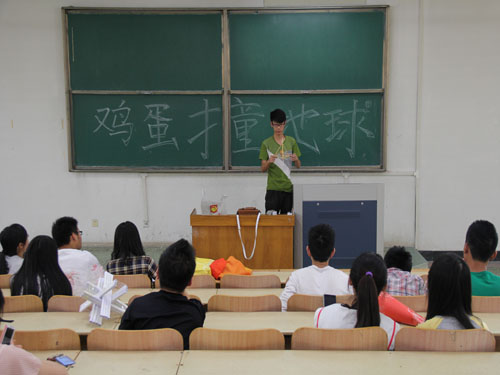 上午进行的鸡蛋撞地球比赛规则很简单,各参赛选手从三楼将包有鸡蛋的装置投到指定地点,要求鸡蛋落地不破损,落点准确。选手们丰富运用自己的创造力,或用塑料袋、或用气囊作为缓冲装置,作为评分标准之一的外形同样是创意非凡,气球、降落伞、弹簧等等各式造型应有尽有。随着比赛哨声响起,各组同学将鸡蛋抛出,楼下的观众屏息凝视,当一个个鸡蛋最终撞到地球时,欢呼声、叹气声、喊声、掌声此起彼伏,让同学们感受到了科技活动带给他们的快乐和激动。