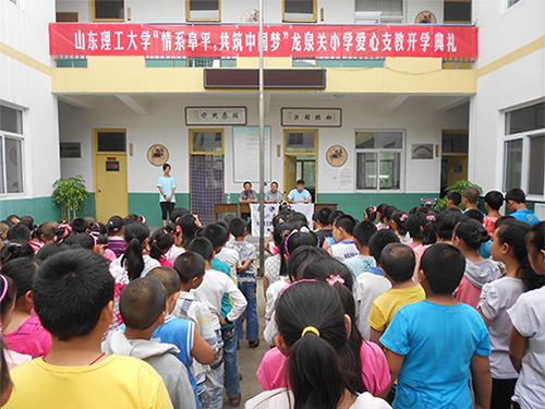 7月23日下午,我院“情系阜平,共筑中国梦”爱心支教服务团队在河北阜平县龙泉关小学举行开学典礼,阜平县教育局局长甄淑平、龙泉关小学校长王浩、爱心支教服务团全体队员参加了此次开学典礼。 典礼上,甄淑平从习近平总书记到来之后龙泉关镇的改变讲起,详细介绍了龙泉关小学的历史发展情况及教育现状,同时对支教服务团的到来表示热烈欢迎及感谢。他在讲话中还流露出对孩子们的无限期盼:“希望孩子们能从大学生身上学到更多的知识,拥有改变贫穷的现状的意识,树立自己的梦想并且坚持不懈地去实现梦想,为社会作出更多贡献。”随后,王浩对龙泉关小学的校史作出补充并鼓励孩子们努力学习,将知识转化为自己的能力,好好做人,不断实现自己的人生价值。 典礼即将结束之际,支教团队队长王晨懿就此次支教工作做出具体汇报,同时表示希望我们的到来能够在孩子们的成长路上增添积极的影响。此次开学典礼在一片热烈掌声中结束。