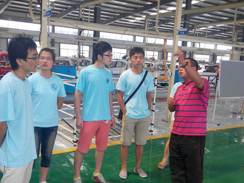 在车间主任刘科的带领下,实践团队队员来到整车生产车间进行参观学习,刘科向队员们介绍了公司的几款车型及其相对性能,他讲到,目前公司电动汽车多采用前轮驱动和独立悬挂,具有轿车级底盘操控和安全性能,空间布置独特,采用1+2式布置结构,能在狭小的车体内构造宽敞的驾乘空间。此外,刘科就电动汽车的各个零部件做了详细讲解,并邀请队员们亲自启动驾驶电动汽车。