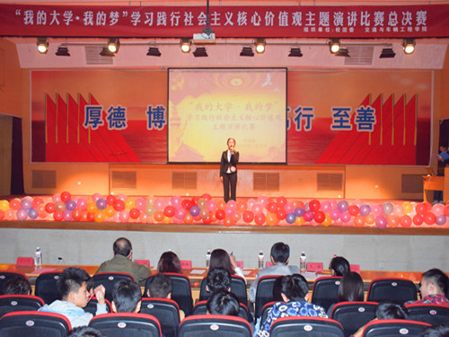 为浓厚校园文化氛围,丰富我校学子课余文化生活,展现大学生演讲魅力与青春风采。10月21日晚,由校团委与我院共同组织的“我的大学·我的梦”学习践行社会主义核心价值观演讲比赛决赛于三号教学楼报告厅举行。此次比赛邀请到文学与新闻传播学院副教授董梅、校团委副书记高静静、校党委宣传部网络部部长宋立平、发展规划处高数研究科科长张明、我院团总支辅导员李璐担任评委,我院团总支相关负责人及我校近500名学生共同观看此次比赛。