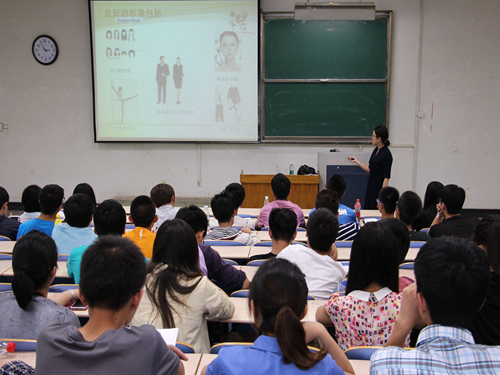 戴洁从“礼仪概说”、“仪表仪态”、“言谈礼仪”、“学校礼仪”、“社交礼仪”五个方面,结合PPT全方位讲解礼仪,语言真挚不失幽默,姿态端庄不失风度。引古博今的讲解和生动的图片展示,向同学们介绍了礼仪的定义与发展历程,在仪态仪表方面,强调了良好形象的重要性,标准的体态、悦人的仪容、得体的穿着是一个人外在形象的体现。戴老师通过坐姿、站姿、蹲姿等亲身示范,同学们积极参与练习,现场气氛十分融洽。在着装方面,戴老师提供了男女标准正装形象作参考,详细介绍了着装要点,不仅有益于学生会日常工作,对日后发展也是颇为受益。讲到言谈礼仪时,戴洁就谈话内容“五不讲”、“六不谈”以及话题的选择等为同学们做了介绍。此外,戴老师还针对学生会的工作特点,通过情景模拟的方式重点讲解了日常工作中应注意的礼仪,如电话礼仪、尊师礼仪、会面礼仪、握手礼仪及位列礼仪等,生动的演示和幽默的解说再一次获得热烈掌声。