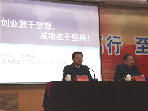 11月12日下午,天朗气清,惠风和畅。我院97级杰出校友、现潍坊瑞驰公司董事总裁张金磊于三号教学楼报告厅为我院学子带来题为《创业源于梦想,成功在于坚持》的创业主题演讲会。此次会议由我院院长高松主持,辅导员戴洁与国睿携四百余位大一学子参加了此次创业论坛会。