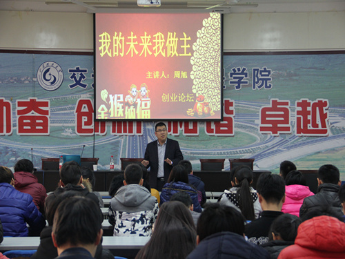 为使同学们了解当前大学生就业动态,帮助同学们明确未来的职业生涯目标,12月17日下午,由我院科创部主办的主题为“我的未来我做主”创业论坛报告会在12号教学楼201教室举行。此次报告会特邀2005年毕业于我校的杰出校友、新华保险淄博中支市场总监兼临淄支公司经理周旭主讲,我院2015级部分学生参加了此次报告会。