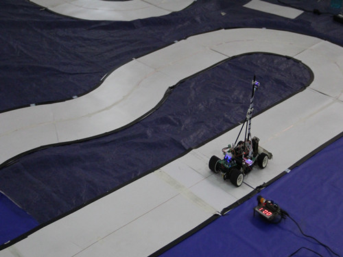 在主持人宣读比赛规则后,比赛正式开始。摄像头组的“FLY”队第一个上场,他们的参赛汽车在赛道上运动灵活,直道处平稳迅速,弯道处转向流畅,三次正反方向的行驶均顺利完成,赛车展示先进及严密的技术的使场外观众惊叹不已。相比“FLY”队来说,同组的山鹰队发挥并不稳定,行驶的过程中,两次偏离赛道出界,导致比赛成绩无效。信标组的比赛设在车展馆的三楼,与其他组的完成赛道不同的是信标组没有赛道,而是通过小车和信号灯的感应完成比赛,小车到达信号灯一定范围内,信号灯便会熄灭。观众纷纷惊叹于参赛选手巧妙的思路和小车的智能化程度,比赛现场战况激烈,气氛十分活跃。最后,电磁直立组更换赛道完成了展示。至此,比赛结束,参赛队伍合影留念。