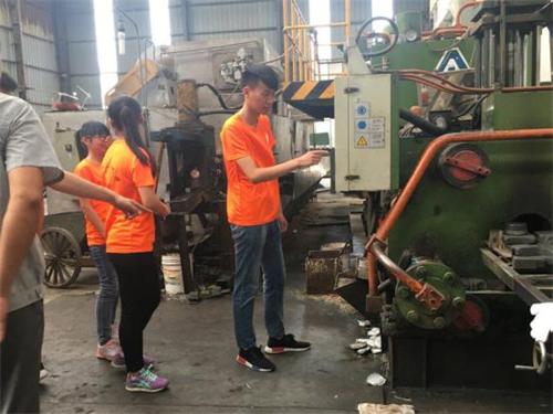 进入车间,首先映入眼帘的是先进的工艺生产线与工人师傅熟练的操作。通过与工人师傅的交谈,队员们了解到挤压成型是生产铝合金门窗的第一道基本工序,这道工序要求熟练的操作挤压机,所以需要很强的技术性。随后,团队先进行了动手实践前安全知识培训与机器操作相关规章制度的学习,以确保实践队员的安全。学习之后,我们参观了工人师傅的操作流程。看到工人师傅熟练的操作,看到一件件银白色门窗初品从挤压机中挤压成型,一个个铝棒经高温后从模具里挤压成型,队员们不禁感慨工人师傅熟能生巧和现代生产工艺的强大。