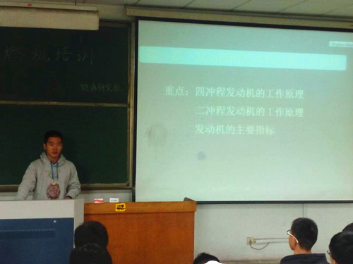 此次培训的主要内容为内燃机的培训,首先由能源研究社科创部的夏鹏为大一成员介绍了内燃机的基本构造,并将难以理解的地方用图片加以阐述,简单明了的将内燃机的整体构造剖析展现在新成员面前。为了使现场人员更好地注意内燃机的结构组成问题,他还将自己在内燃机实验时所遇到的问题及解决方案与大家进行分享,在相互交流中提升他们对于内燃机知识的掌握程度。