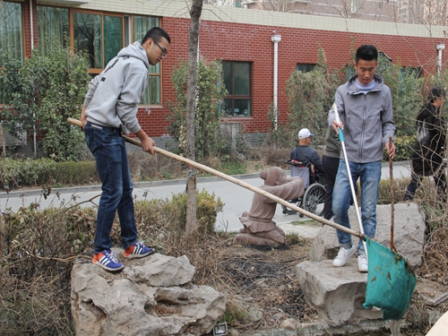 活动中协会成员分为打扫公园和与老人沟通两组,在两协会负责人的共同组织下,活动进行非常顺利。打扫公园组同学手拿工具,对公园中道路两旁的杂草进行了清扫,并将小溪中的杂物捞出。经过同学们认真的打扫,不仅还老人们一个干净,舒适的休闲空间,还发扬了大学生不怕苦,不惧脏的品质。在这一过程中同学们并没有注意到渐渐变脏的衣服,脸上挂着的微笑却真实的折射出他们对老人们关爱。与老人沟通组同学们深蹲着,与老人们四目相望,诉说着各自的故事,询问着衣食住行,帮老人们按下电梯的开关,扶老人们慢慢走着,感受生命的长度,每一个眼神都透露着温暖,紧握的双手传递着隔代人的愿望,缓缓前行的轮椅与轻柔的声音在大厅持久的回荡。
