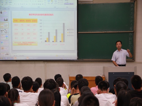 随后高萌又针对我院构建“三平台、一体系”,着力培养“五有人才”的举措进行了解读。他向同学们讲解了学院“勤奋、创新、和谐、卓越”院风的内涵,重点解读了理论教学、创新实践、素质教育三个平台的具体内容,并介绍了独具我院特色的荣誉体系,引导广大学子向“五有”人才标准对标。为使新生对我院的主要培养举措有直观的了解,高萌通过图片向新生展示了我院培育“五有”人才过程中取得的优异成绩,丰富的图片素材激发了同学们的兴趣,现场学生热情高涨。