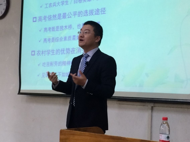 王玉海博士的报告围绕生存发展与改变这一主题,详细介绍了“我的大学,我们的大学”。会议以唐代诗人朱庆馀的《近试上张水部籍》为背景展开,层层递进地讲解了寒门再难出贵子、中国知识分子传统、寒门依然出贵子、寒门如何出贵子四方面问题。在验证寒门出贵子这一论点的同时,利用了大量清华寒门学子以及具有良好家庭环境的学子进行对比,形象的论证了寒门并不是难出贵子,具有良好家庭环境的人拥有的只是优异的先天条件,最重要的是学习上具备坚持到底的心。在讲解中国知识分子传统中,他以历史是最好的老师,不拘一格降人才这两句话总结,同时运用大量历史人物与历史事件说明从古至今有无数寒门学子虽先天家庭条件或者身体条件成为短板,但依旧通过不懈的努力而成为伟人。最后他总结说:大家要以天下为己任,笑对贫穷,主动磨砺,读书思考,从五、四、三多方面提高文学、科学、国学素养,有效沟通、合理表达等修身方法,鼓励广大学子积极向上。