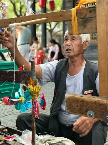 实践团员们首先拜访了捏面师傅祝师傅。捏面人是祝师傅子从小的“功课”,打记事起,他的童年玩具都少不了祖父、父亲捏的“面人儿”。孙悟空、沙和尚,这些出现在说书人口中的形象,都能够通过“面人儿”活起来。到自己长大一些,父亲就开始将这门手艺传递给他,而如今,虽然已经不需要这门手艺“糊口”,但他依然带着“家族的使命”,将它交给了儿子,希望同儿子一起,守护着这门“艺术”,一代又一代的传承下去。谈到这些,他的脸上溢满了骄傲与真诚,让我们深受感动。
