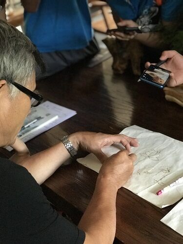 随后我们拜访了“焚香烙画”大师--杨祖乾。用点燃的香烛在薄如蝉翼的宣纸上复制《清明上河图》、《麻姑献寿》等画作,完成后的“焚香烙画”人物线条流畅,表情丰富细腻,形象栩栩如生,书法也是苍劲有力。虽色彩单一,但黑白灰处理恰当、层次感饱满,浓淡干湿堪比翰墨艺术,效果鲜明,有强烈的视觉冲击力。