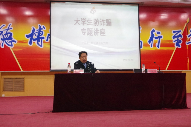 第四阶段,我校学区派出所所长刘冲为全体与会人员做了大学生防诈骗专题讲座。刘冲从网络安全、案件性质认定等几个层面,通过理论讲解、典型案例分析告诫同学们,公民有网络发言自由权,但必须恪守法律的边界,不可任性为之。另外,刘冲提到“十个凡是”,提醒同学们注意学习安全知识、提高辨别能力。