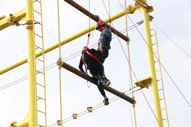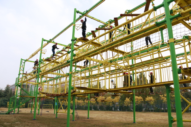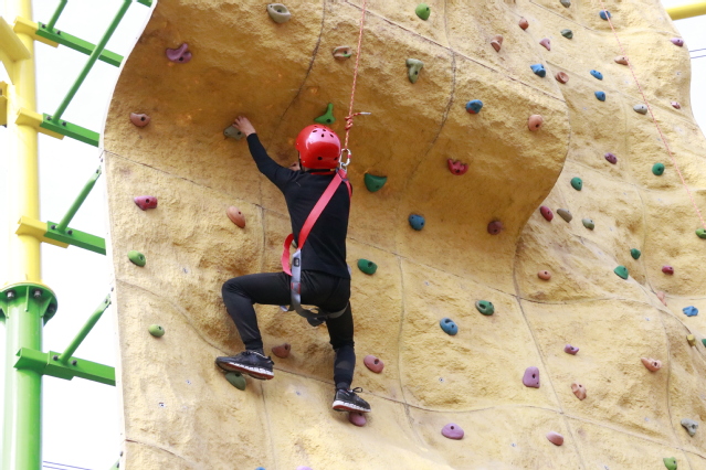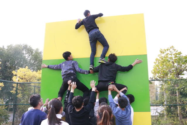 首先同学们进行队旗制作、高空攀岩、空中走廊和爬毕业墙等活动,在攀岩项目中,队员依次身着护具,在安全绳的保护下,身体紧紧贴服着岩壁,脚蹬手抓,不断寻找着脚的踩点,还要观察选择合理的路径,在同学们的邀请下,周燕燕和崔建强也体验了一番。在爬毕业墙项目中,同学们交流密切、配合默契,在攀爬过程中同学们肯甘为人梯,手挽手,肩并肩,最终最后一名同学也攀登成功。