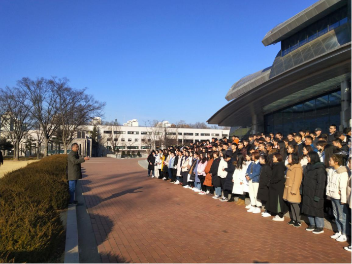 27日清晨的水原气温异常寒冷,但各学院师生代表早早赶到团书馆前,一周紧张的分班学习体验,大家难得能够全体聚在一起,在带队老师的指挥安排下,代表团留下了在成均馆宝贵的一张全体合影。随后,各学院又分头合影留念,代表团团长王建兴书记对全体学员过去一周的优异表现给与了肯定,并对下一阶段的学习安排和注意事项进行了集中部署。