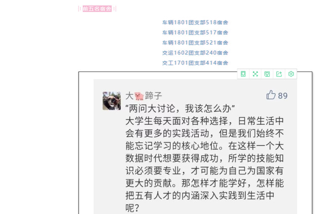 日前,学院在 “两问大讨论”主题征文活动中获得优异成绩,在微信端征文中,学院2个团支部进入前三名;宿舍征文评比中包揽微信端、微博端全部奖项;交工1701团支部赵在壮同学在QQ空间端征文中获得第1名。