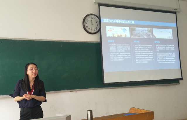 董骊珠高级工程师首先陈述了RFID无线射频识别技术的定义,并结合它的优势、工作原理和应用前景对该技术进行系统介绍。随后,基于视频识别交通信息采集现存问题、汽车电子标识技术介绍、相关标准等方面详细介绍了汽车标识技术。同时借助典型应用案例,深度讲解其解决方案,使该技术形象更加立体化,与此同时也加深了在座同学的理解。除此之外,她还介绍了RFID无线射频技术在提高管理水平、服务优化创新、创新治安防控、创新商业模式、增强检测控制、促进产业升级等方面的应用。最后,列举多个城市应用该系统的项目,并简要陈述相关的项目背景、系统方案、客户收益,使全体师生对汽车电子标识技术有了更全面的认识。