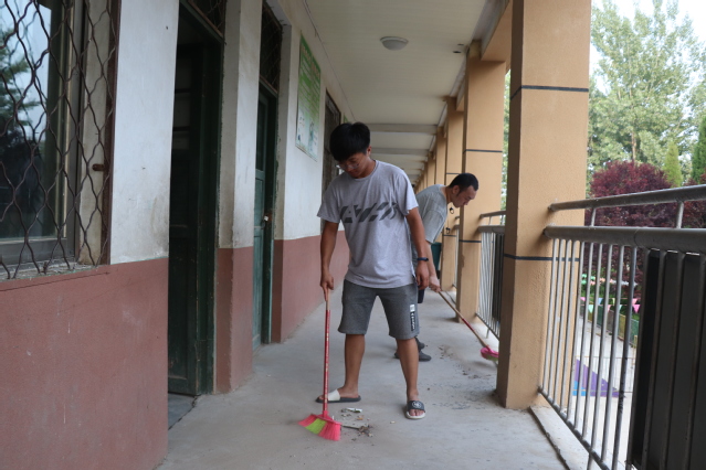 为了创造良好的实践环境和教学环境,促进团队之后各项工作的顺利开展,团队全体成员在进行短暂的休整后,对张集镇刘庄小学进行清理打扫。首先,团队对清洁工作进行分组,分别对会议室、团队住宿区域、楼前地面区域、楼梯楼道以及二楼的三间教室进行详细分工,明确每位成员的负责区域任务。分工结束后,团队成员积极的进行卫生清洁,并针对不同的情况,制定合适的清洁方法。对于住宿区域,由于是幼儿园教学用教室,由女生细致清洁,在尽量保持教室原貌进行清洁;对于尘土较厚的教室,先洒水,后清扫;对课桌课椅,用抹布仔细擦拭;对于楼前水泥地区域,落叶较多,先用大扫帚进行大范围清理,再用小扫帚善后。期间,有成员发现教学楼内蜘蛛网较多,主动对楼内的死角的蜘蛛网进行清理。经过两个余小时的清洁打扫,刘庄小学整体环境得到明显改善。