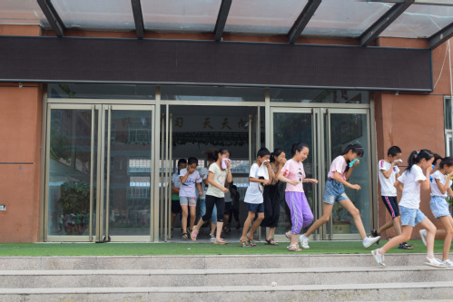 上午8时,随着哨声的响起,各班支教老师迅速组织学生进行疏散,楼层拐角处负责人也在第一时间配合疏散学生。各班级学生在实践队员的指挥下,弯着腰,用手帕、湿毛巾等捂住口鼻,沿着指定楼梯口有序撤离至操场的安全地带,此次活动共历时1分09秒。