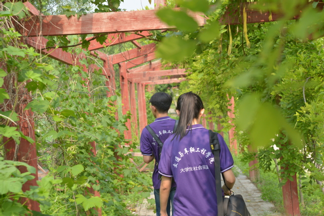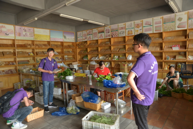 调研团事先联系好王主任,之后有序进入有机农场展开调研。进入大门,左侧就是农作物包装处理工作室,调研团一行人进入工作室参观。该农场生产的各种绿色无公害农产品在此工作室经过简单的处理、包装之后。被运出进行销售。我们看到豆角、土豆、辣椒、小南瓜、茄子以及玉米等农产品整齐摆放,两位来自村里的工作人员正在低头专心地包装农产品。见到我们进屋,热情地给我们打招呼。为了不打扰大姐工作,队长简单采访了大姐几个关于农产品种植、收获、销售的问题。我们了解到:农场的蔬菜水果都是有机的,不打农药,大棚种植,接下来我们也参观了种植蔬菜的大棚。之后,我们先后参观了蜂巢田、梨园、樱桃园、有机大棚、打谷场等。一路上我们还偶遇几个大叔在种植田里工作,前去帮忙,大叔简单教给我们工具的使用方式,愉快聊天中了解到该农场的工作、分配机制。除了各种有机农作物的种植田,农场里建设了很多的观光亭、休息区,供游客游玩、参观。有湖、有亭、有美景,真是优哉游哉。更令调研团人员兴奋的是,我们还见到了正在吃草的羊、马。