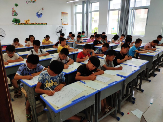 支教团老师非常重视四年级的期末考试,这场考试不单是为了检验孩子们的学习成果更是对自己支教经历的一次检验。支教团老师和孩子们一起为了这个考验共同奋斗。在经过支教团老师对考场的严格布置后,8月8日上午八点期末测试准时开始。学生们单人单桌进行考试,他们各个各个精神饱满、奋笔疾书。经过一小时的努力“奋战”,同学们微曲的眉头渐渐舒展开来,学生们随着下课铃声交上自己的考卷结束了期末测验。