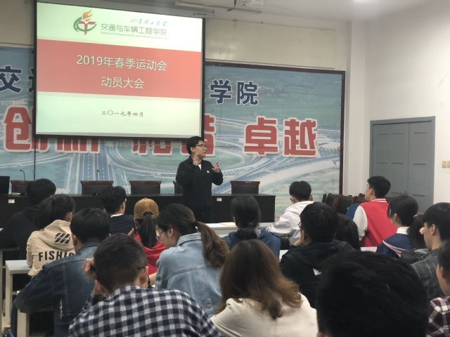 为了更好地贯彻“体育育人”方针,摆正运动会的正常开展,我院特召开“交通与车辆工程学院2019年春季运动会动员大会”,此次会议由学院团总支国睿老师主持。他首先肯定了运动员的付出,随后提到:开展运动会的意义是为了强身健体,使同学们成为有健康身心的人才,也是对同学们身体素质、竞争才能、心理承受能力等综合素质的考验,更是对我院全体师生群体意识、竞争意识、团队意识、顽强拼搏精神的综合体现。