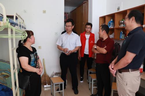 褚兆勇一行人进入九号宿舍楼内部,向宿管阿姨询问了新生入住情况。随后,院领导到达新生宿舍,对到来的学生和学生家长表示热烈的欢迎,领导们向家长询问他们关于新生宿舍的意见并与其探讨今后对学生宿舍生活的管理工作。之后,领导们对新生讲到进入新宿舍要学会整理宿舍卫生,保持卫生成绩,注意寝室安全,保管好个人财务,遇到问题要及时的向辅导员及宿舍管理人员反映,并鼓励新生独立整理宿舍,养成独立自主的习惯以适应大学生活。最终,从与学生的交流中获取了新生们对宿舍的环境以及公用设备的意见。热情的话语,亲切的问候温暖人心,使新生感受到学院领导关怀的同时,体验到家的温馨,新生们纷纷对学院领导及宿舍管理人员为其营造的良好氛围与环境表示深切感谢。