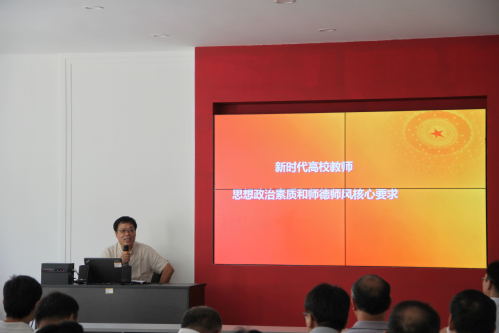 许东波从新时代党和国家高度重视教师队伍建设,新方位、新征程、新使命对高校教师提出了新的更高要求,怎样提高高校教师思想政治素质和师德师风,新时代高校教师师德师风的核心要求等四个方面作了报告。
