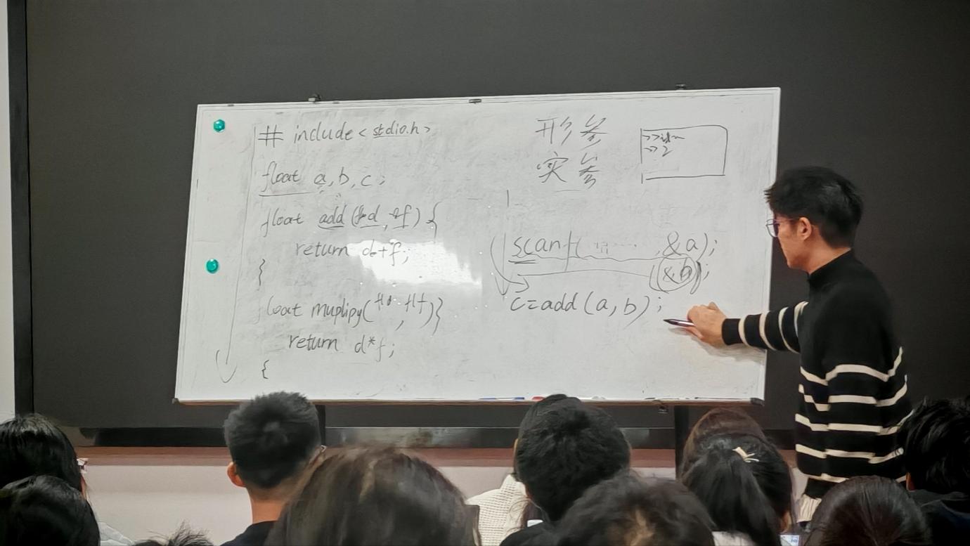 在C语言知识讲授环节,会长陈宇航担任主讲人。他从C语言基础知识入手,逐步深入解析函数库、函数、参数类型、定义类型等核心概念,将抽象的程序逻辑转化为易懂的操作演示。清晰与细致的讲解让成员们能够快速跟上思路,也充分调动了他们的学习积极性。
