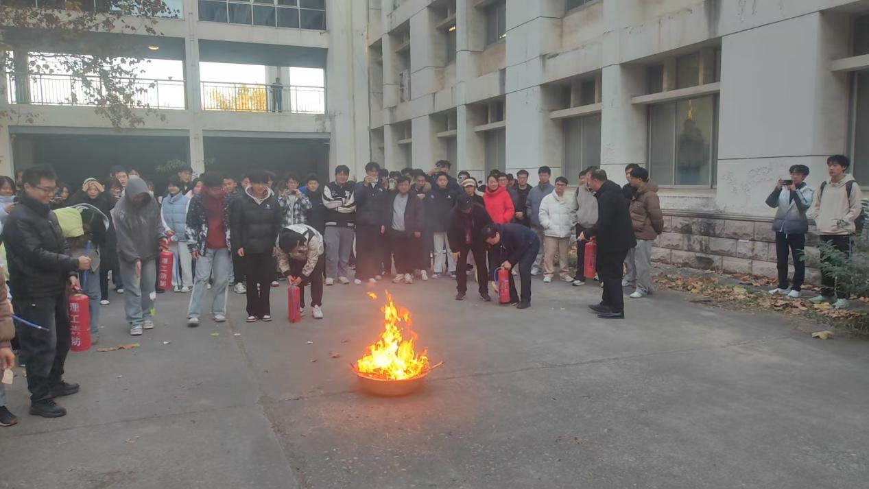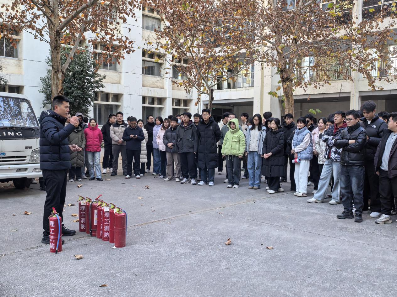 随后,现场依次组织了应急逃生疏散与消防实地演练。参训师生在引导下,按预定路线迅速有序撤离。在机械交通实验楼东侧,学校保卫处工作人员讲解了灭火器的检查要点与规范操作方法,并指导师生进行实操练习,确保掌握初期火灾扑救技能。